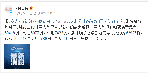 根据当地时间3月23日18时意大利卫生部公布的最近数据,意大利现有新冠病毒患者50418例,死亡6077例,治愈7432例,累计确诊感染新冠病毒总人数为63927例,较3月22日18时新增4789例,新增601例死亡病例。(韩硕)
