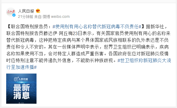 据新华社,联合国特别报告员滕达伊·阿丘梅23日表示,有关国家官员使用别有用心的名称来替代新冠病毒,这种把特定疾病与某个具体国家或民族相联系的仇外表达是不负责任和令人不安的。其在一份媒体声明中表示,世界卫生组织已明确表示,疾病名称如果使用不当,会对特定人群造成严重伤害。各国政府在应对新冠肺炎疫情时应特别注意不能传递仇外信息,不能助长种族歧视。