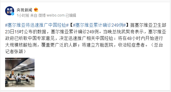 据塞尔维亚卫生部23日15时公布的数据,塞尔维亚累计确诊249例。当晚总统武契奇表示,塞尔维亚政府已听取中国专家意见,决定迅速推广相关中国经验:将在48小时内开始进行大规模核酸检测,覆盖更广泛的人群;将建立方舱医院,收治轻症患者。(总台记者张颖)