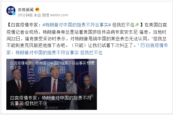 在美国白宫疫情记者会现场,特朗普身旁总是站着美国顶级传染病专家安东尼·福奇。当地时间22日,福奇接受采访时表示,对特朗普甩锅中国的某些表态无法认同,“但我总不能到麦克风前把他推下去吧。(只能)让我们试着下次纠正了。”