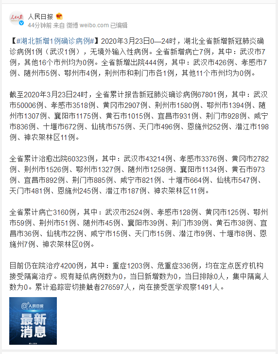 2020年3月23日0—24时,湖北全省新增新冠肺炎确诊病例1例(武汉1例),无境外输入性病例。全省新增病亡7例,其中:武汉市7例,其他16个市州均为0例。全省新增出院444例,其中:武汉市426例、孝感市7例、随州市5例、鄂州市4例,荆州市和荆门市各1例,其他11个市州均为0例。