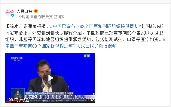 国新办新闻发布会上,外交部副部长罗照辉介绍,中国政府已经宣布向83个国家以及世卫组织、非盟等国际和地区组织提供紧急援助,包括检测试剂、口罩等医疗物资。#中国已宣布向83个国家提供援助#