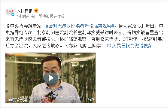 近日,中央指导组专家、北京朝阳医院副院长童朝晖接受采访时表示,密切接触者里查出来有无症状感染者都按照严格的隔离观察,直到临床症状、CT影像、核酸转阴以后才会出院,大家应该放心。(郑薛飞腾 王翔宇)
