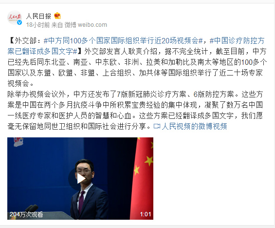 除举办视频会议外,中方还发布了7版新冠肺炎诊疗方案、6版防控方案。这些方案是中国在两个多月抗疫斗争中所积累宝贵经验的集中体现,凝聚了数万名中国一线医疗专家和医护人员的智慧和心血。这些方案已经翻译成多国文字,我们愿毫无保留地同世卫组织和国际社会进行分享。