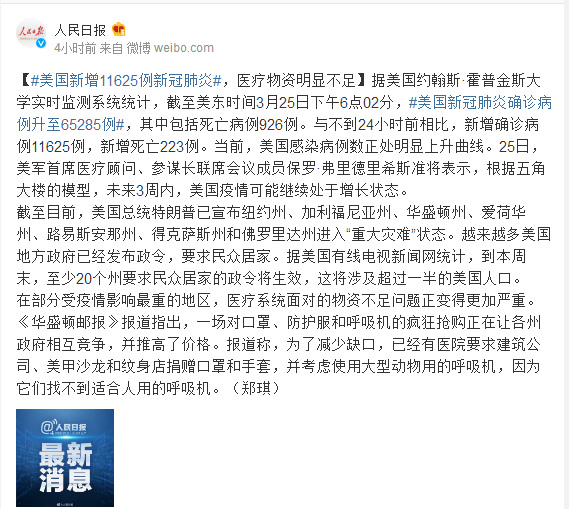 据美国约翰斯·霍普金斯大学实时监测系统统计,截至美东时间3月25日下午6点02分,#美国新冠肺炎确诊病例升至65285例#,其中包括死亡病例926例。与不到24小时前相比,新增确诊病例11625例,新增死亡223例。当前,美国感染病例数正处明显上升曲线。25日,美军首席医疗顾问、参谋长联席会议成员保罗·弗里德里希斯准将表示,根据五角大楼的模型,未来3周内,美国疫情可能继续处于增长状态。