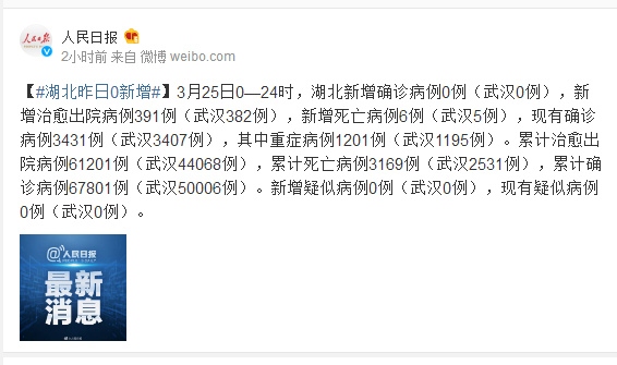 3月25日0—24时,湖北新增确诊病例0例(武汉0例),新增治愈出院病例391例(武汉382例),新增死亡病例6例(武汉5例),现有确诊病例3431例(武汉3407例),其中重症病例1201例(武汉1195例)。累计治愈出院病例61201例(武汉44068例),累计死亡病例3169例(武汉2531例),累计确诊病例67801例(武汉50006例)。新增疑似病例0例(武汉0例),现有疑似病例0例(武汉0例)。