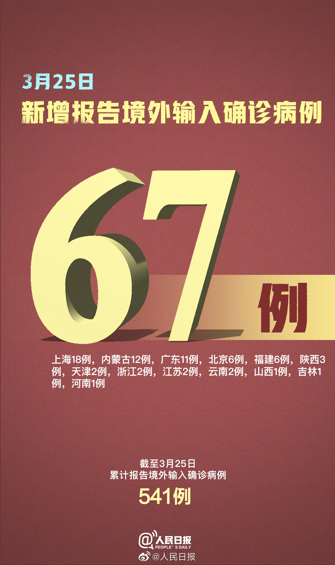 3月25日0—24时,新增报告境外输入确诊病例67例(上海18例,内蒙古12例,广东11例,北京6例,福建6例,陕西3例,天津2例,浙江2例,江苏2例,云南2例,山西1例,吉林1例,河南1例)。截至3月25日24时,累计报告境外输入确诊病例541例。