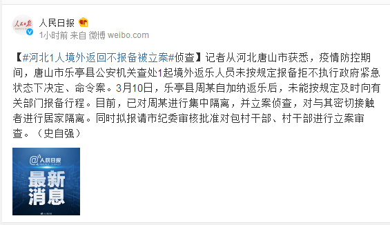 记者从河北唐山市获悉,疫情防控期间,唐山市乐亭县公安机关查处1起境外返乐人员未按规定报备拒不执行政府紧急状态下决定、命令案。3月10日,乐亭县周某自加纳返乐后,未能按规定及时向有关部门报备行程。目前,已对周某进行集中隔离,并立案侦查,对与其密切接触者进行居家隔离。同时拟报请市纪委审核批准对包村干部、村干部进行立案审查。(史自强)