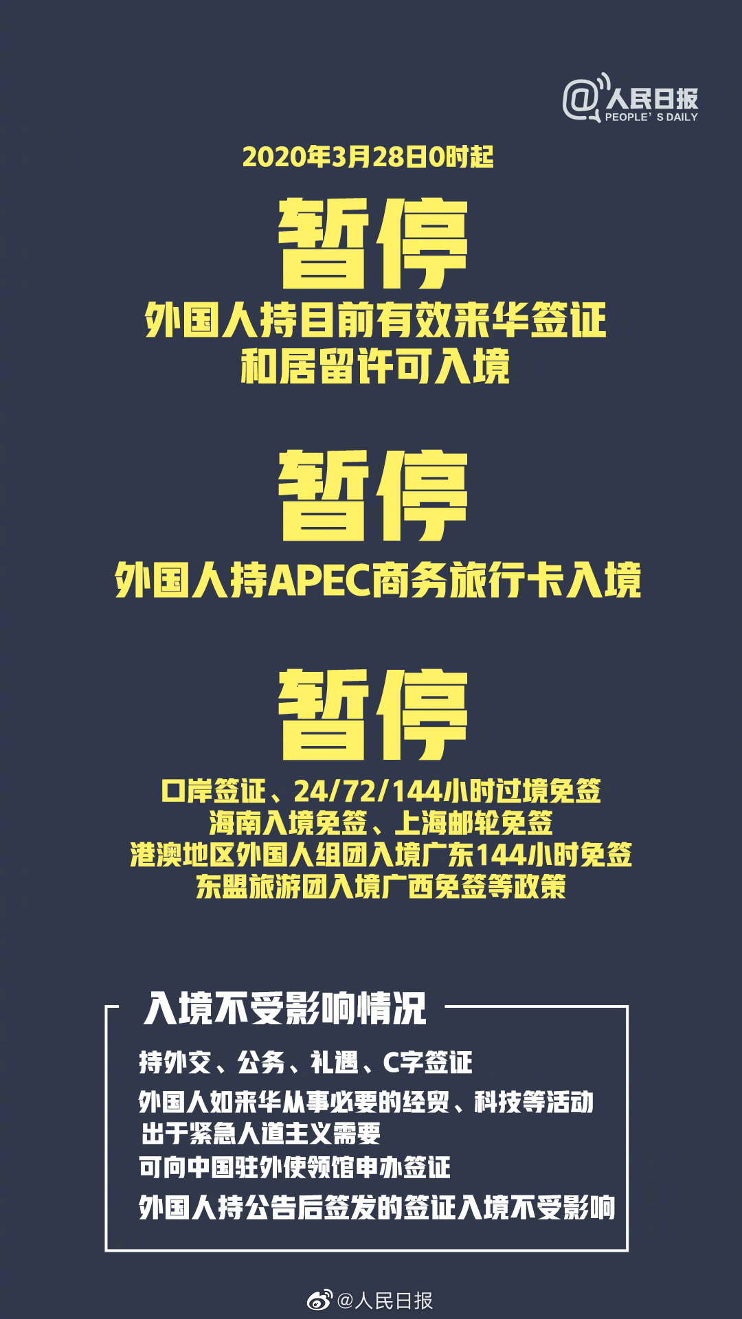 外交部发布声明,28日起#暂停持有效中国签证的外国人入境#。哪些情况被暂停入境?哪些免签政策将被暂停?哪些情况可以入境?一图看懂外国人持有效签证暂停入境政策↓↓