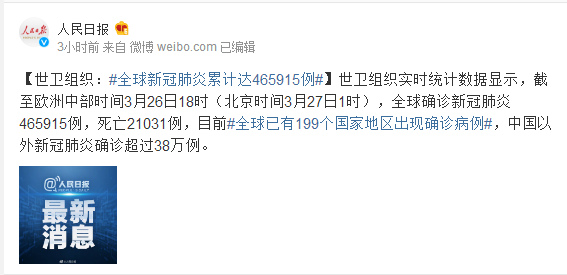 世卫组织实时统计数据显示,截至欧洲中部时间3月26日18时(北京时间3月27日1时),全球确诊新冠肺炎465915例,死亡21031例,目前#全球已有199个国家地区出现确诊病例#,中国以外新冠肺炎确诊超过38万例。
