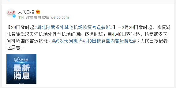 自3月29日零时起,恢复湖北省除武汉天河机场外其他机场的国内客运航班。自4月8日零时起,恢复武汉天河机场国内客运航班。#武汉天河机场4月8日恢复国内客运航班#(人民日报记者赵展慧)