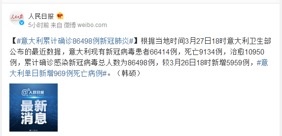根据当地时间3月27日18时意大利卫生部公布的最近数据,意大利现有新冠病毒患者66414例,死亡9134例,治愈10950例,累计确诊感染新冠病毒总人数为86498例,较3月26日18时新增5959例,#意大利单日新增969例死亡病例#。(韩硕)
