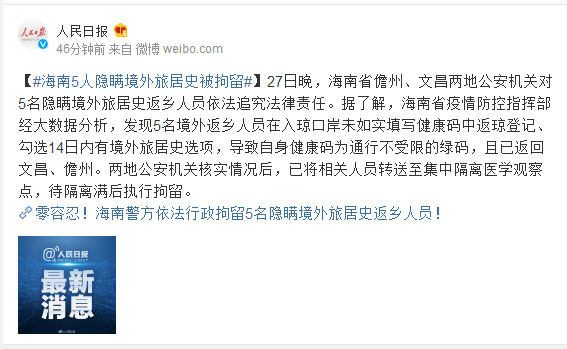 27日晚,海南省儋州、文昌两地公安机关对5名隐瞒境外旅居史返乡人员依法追究法律责任。据了解,海南省疫情防控指挥部经大数据分析,发现5名境外返乡人员在入琼口岸未如实填写健康码中返琼登记、勾选14日内有境外旅居史选项,导致自身健康码为通行不受限的绿码,且已返回文昌、儋州。两地公安机关核实情况后,已将相关人员转送至集中隔离医学观察点,待隔离满后执行拘留。
