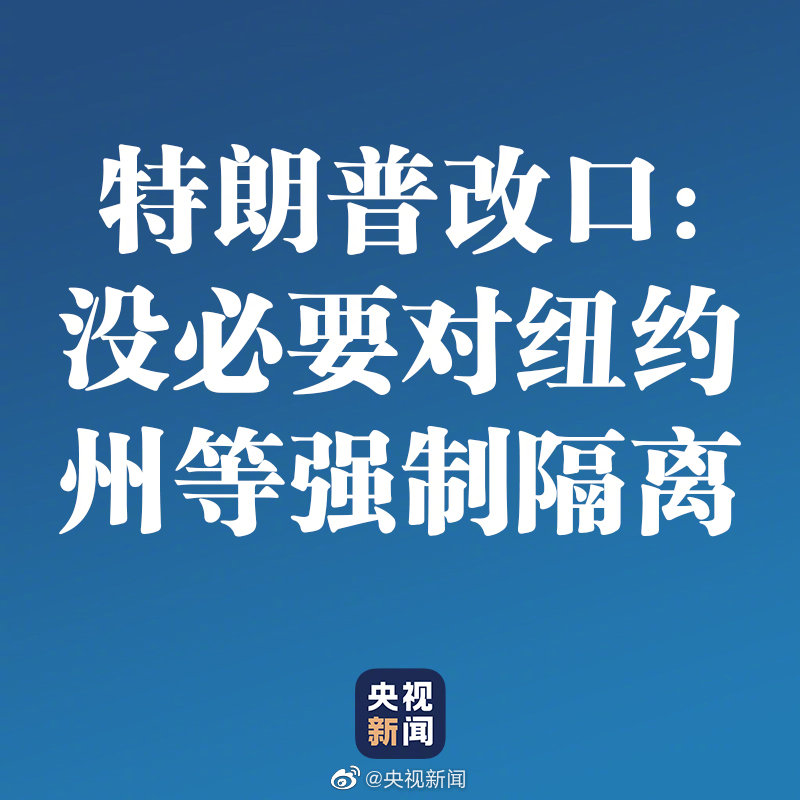 #特朗普称纽约州等地无需强制隔离#【#特朗普改口没必要对纽约州等强制隔离#】3月28日晚,美国总统特朗普通过社交媒体宣布,经与纽约州、新泽西州和康涅狄格州州长磋商,他已要求美国疾控中心发布上述三州的旅行建议。特朗普表示没必要对这三州隔离。此前,特朗普曾表示考虑对上述三州实施强制隔离,#纽约州长称强制隔离相当于宣战#。(央视记者王逢治)