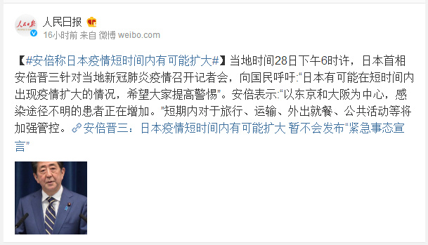 当地时间28日下午6时许,日本首相安倍晋三针对当地新冠肺炎疫情召开记者会,向国民呼吁:“日本有可能在短时间内出现疫情扩大的情况,希望大家提高警惕”。安倍表示:“以东京和大阪为中心,感染途径不明的患者正在增加。”短期内对于旅行、运输、外出就餐、公共活动等将加强管控。