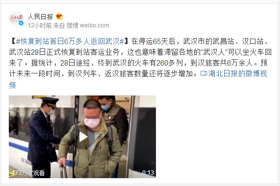 在停运65天后,武汉市的武昌站、汉口站、武汉站28日正式恢复到站客运业务,这也意味着滞留各地的“武汉人”可以坐火车回来了。据统计,28日途经、终到武汉的火车有260多列,到汉旅客共6万余人。预计未来一段时间,到汉列车、返汉旅客数量还将逐步增加。