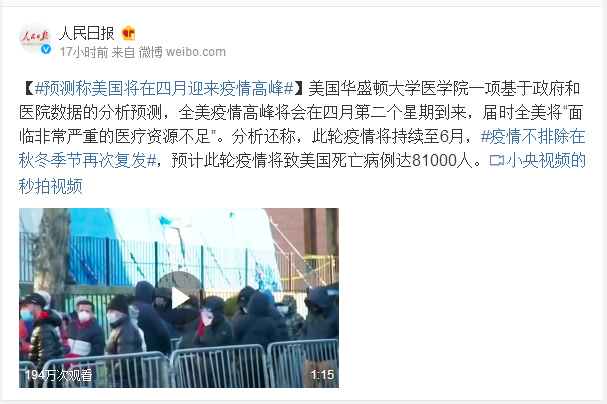 美国华盛顿大学医学院一项基于政府和医院数据的分析预测,全美疫情高峰将会在四月第二个星期到来,届时全美将“面临非常严重的医疗资源不足”。分析还称,此轮疫情将持续至6月,#疫情不排除在秋冬季节再次复发#,预计此轮疫情将致美国死亡病例达81000人。