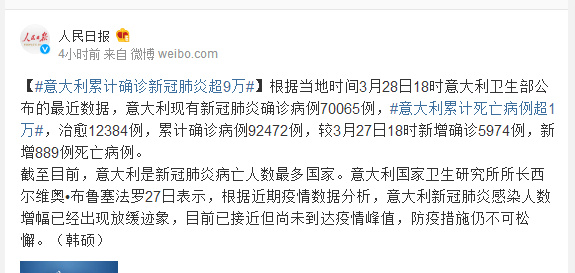 根据当地时间3月28日18时意大利卫生部公布的最近数据,意大利现有新冠肺炎确诊病例70065例,#意大利累计死亡病例超1万#,治愈12384例,累计确诊病例92472例,较3月27日18时新增确诊5974例,新增889例死亡病例。