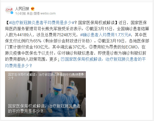 近日,国家医保局医药服务管理司司长熊先军接受采访表示:①截至3月15日,全国确诊患者结算人数为44189人,涉及总费用75248万元,#确诊患者人均费用1.7万元#,其中医保支付比例约为65%(剩余部分由财政进行补助)。②截至3月19日,各地医保部门累计拨付资金193亿元,其中湖北省37亿元。③费用较为昂贵的如ECMO,在肺炎疫情中医保也予以支付。④对确诊和疑似患者,即使是诊断为确诊和疑似前的费用都纳入政策范围。更多↓ 国家医保局权威解读:治疗新冠肺炎患者的平均费用是多少?