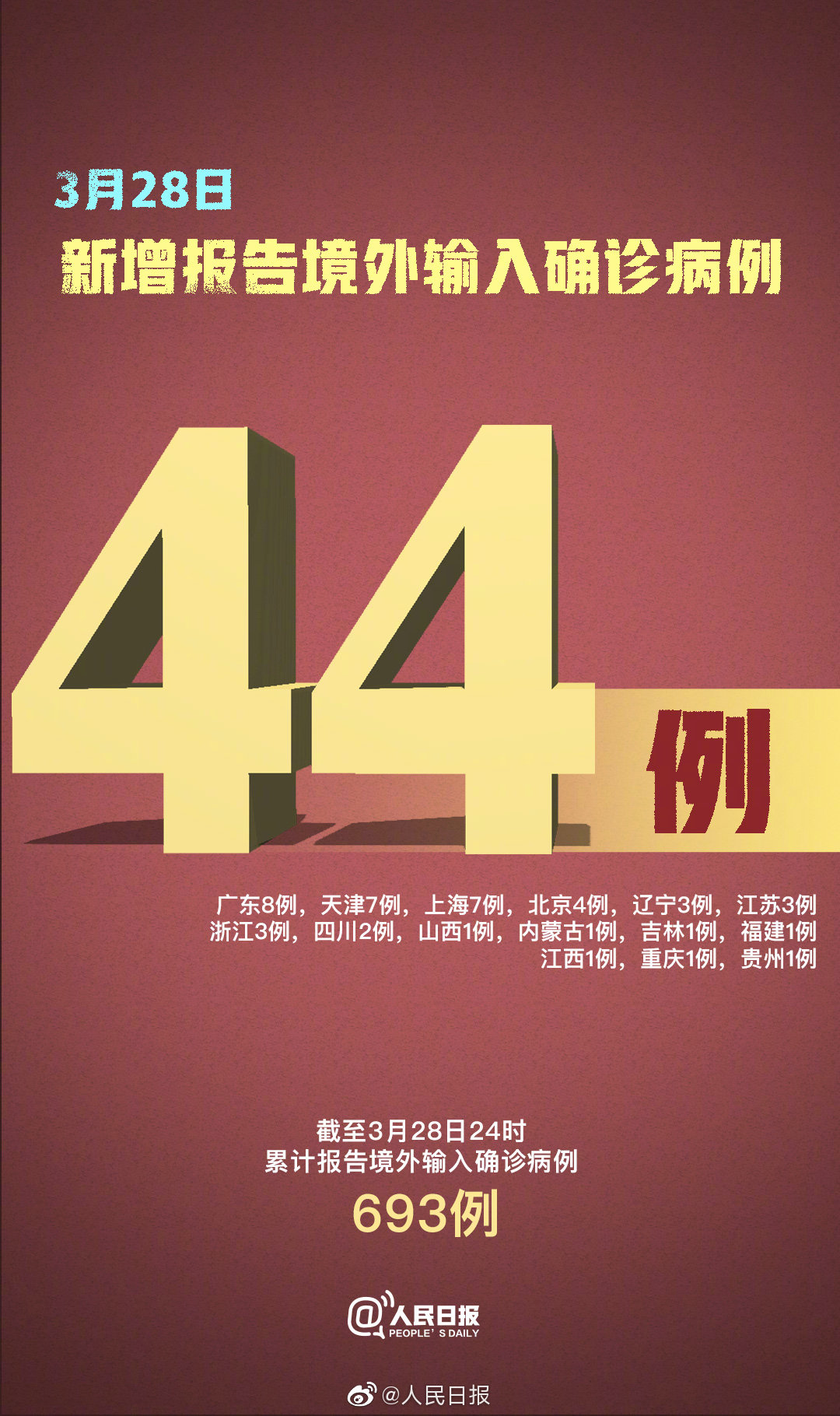 3月28日0—24时,新增报告境外输入确诊病例44例(广东8例,天津7例,上海7例,北京4例,辽宁3例,江苏3例,浙江3例,四川2例,山西1例,内蒙古1例,吉林1例,福建1例,江西1例,重庆1例,贵州1例)。截至3月28日24时,#累计报告境外输入确诊病例693例#。