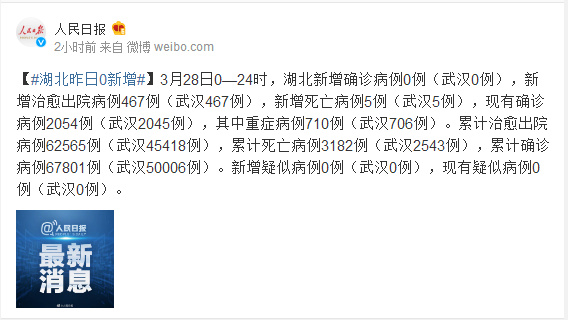 3月28日0—24时,湖北新增确诊病例0例(武汉0例),新增治愈出院病例467例(武汉467例),新增死亡病例5例(武汉5例),现有确诊病例2054例(武汉2045例),其中重症病例710例(武汉706例)。累计治愈出院病例62565例(武汉45418例),累计死亡病例3182例(武汉2543例),累计确诊病例67801例(武汉50006例)。新增疑似病例0例(武汉0例),现有疑似病例0例(武汉0例)。
