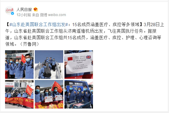 3月28日上午,山东省赴英国联合工作组从济南遥墙机场出发,飞往英国执行任务。据报道,山东省赴英国联合工作组共15名成员,涵盖医疗、疾控、护理、心理咨询等领域。