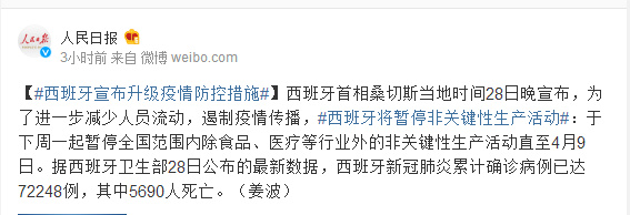 西班牙首相桑切斯当地时间28日晚宣布,为了进一步减少人员流动,遏制疫情传播,#西班牙将暂停非关键性生产活动#:于下周一起暂停全国范围内除食品、医疗等行业外的非关键性生产活动直至4月9日。据西班牙卫生部28日公布的最新数据,西班牙新冠肺炎累计确诊病例已达72248例,其中5690人死亡。(姜波)
