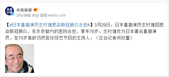 3月29日,日本喜剧演员志村健因感染新冠肺炎,在东京都内的医院去世,享年70岁。志村健作为日本著名喜剧演员,在70岁高龄仍然担任综艺节目的主持人。(总台记者何欣蕾)