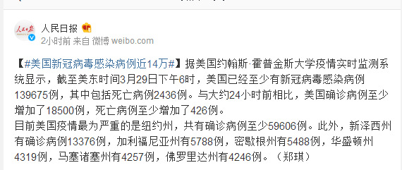 据美国约翰斯·霍普金斯大学疫情实时监测系统显示,截至美东时间3月29日下午6时,美国已经至少有新冠病毒感染病例139675例,其中包括死亡病例2436例。与大约24小时前相比,美国确诊病例至少增加了18500例,死亡病例至少增加了426例。
