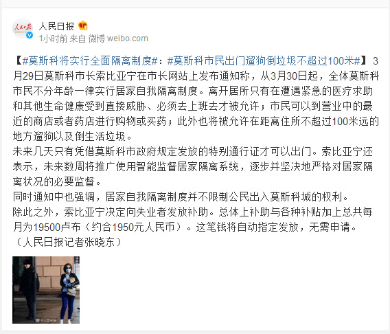 3月29日莫斯科市长索比亚宁在市长网站上发布通知称,从3月30日起,全体莫斯科市民不分年龄一律实行居家自我隔离制度。离开居所只有在遭遇紧急的医疗求助和其他生命健康受到直接威胁、必须去上班去才被允许;市民可以到营业中的最近的商店或者药店进行购物或买药;此外也将被允许在距离住所不超过100米远的地方遛狗以及倒生活垃圾。