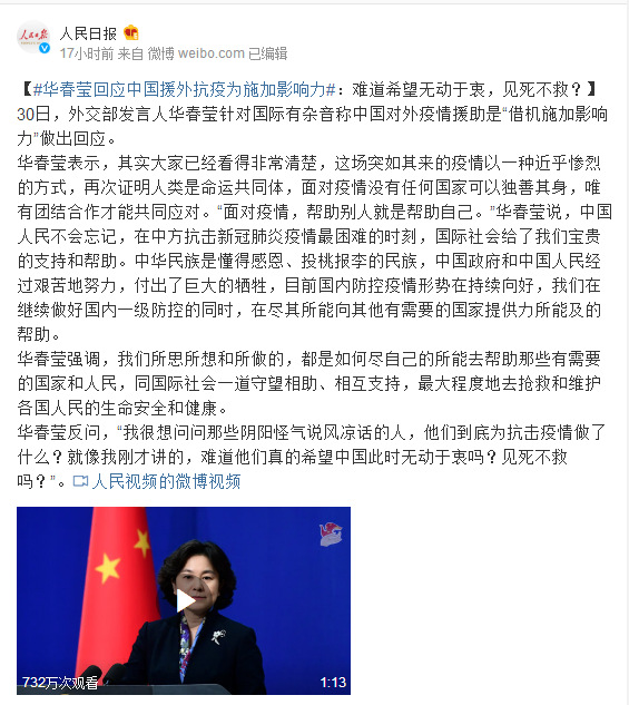 30日,外交部发言人华春莹针对国际有杂音称中国对外疫情援助是“借机施加影响力”做出回应。