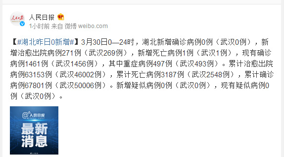 3月30日0—24时,湖北新增确诊病例0例(武汉0例),新增治愈出院病例271例(武汉269例),新增死亡病例1例(武汉1例),现有确诊病例1461例(武汉1456例),其中重症病例497例(武汉493例)。累计治愈出院病例63153例(武汉46002例),累计死亡病例3187例(武汉2548例),累计确诊病例67801例(武汉50006例)。新增疑似病例0例(武汉0例),现有疑似病例0例(武汉0例)。