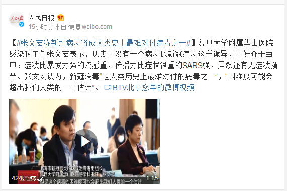 复旦大学附属华山医院感染科主任张文宏表示,历史上没有一个病毒像新冠病毒这样诡异,正好介于当中:症状比暴发力强的流感重,传播力比症状很重的SARS强,居然还有无症状携带。张文宏认为,新冠病毒“是人类历史上最难对付的病毒之一”,“困难度可能会超出我们人类的一个估计”。