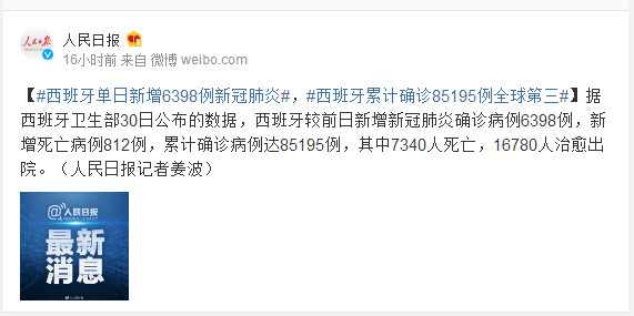 据西班牙卫生部30日公布的数据,西班牙较前日新增新冠肺炎确诊病例6398例,新增死亡病例812例,累计确诊病例达85195例,其中7340人死亡,16780人治愈出院。(人民日报记者姜波)