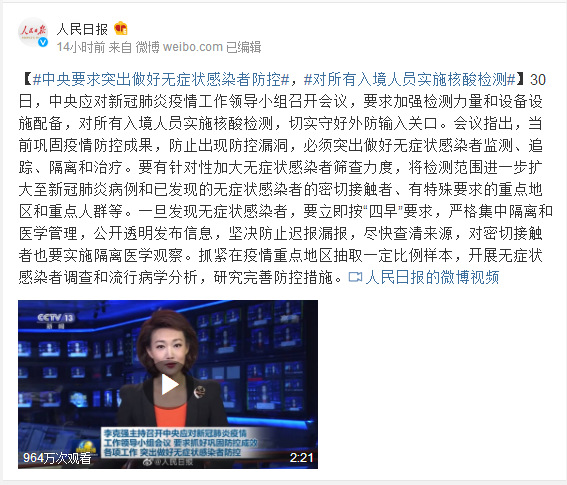 30日,中央应对新冠肺炎疫情工作领导小组召开会议,要求加强检测力量和设备设施配备,对所有入境人员实施核酸检测,切实守好外防输入关口。会议指出,当前巩固疫情防控成果,防止出现防控漏洞,必须突出做好无症状感染者监测、追踪、隔离和治疗。要有针对性加大无症状感染者筛查力度,将检测范围进一步扩大至新冠肺炎病例和已发现的无症状感染者的密切接触者、有特殊要求的重点地区和重点人群等。一旦发现无症状感染者,要立即按“四早”要求,严格集中隔离和医学管理,公开透明发布信息,坚决防止迟报漏报,尽快查清来源,对密切接触者也要实施隔离医学观察。抓紧在疫情重点地区抽取一定比例样本,开展无症状感染者调查和流行病学分析,研究完善防控措施。