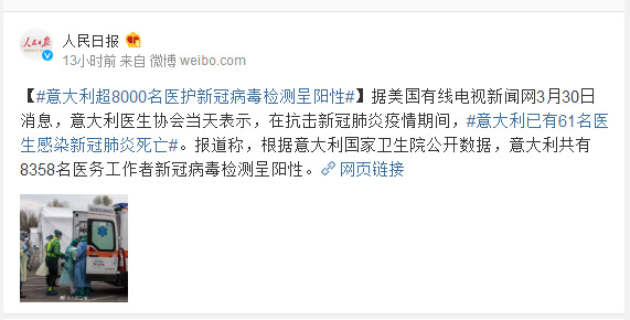 据美国有线电视新闻网3月30日消息,意大利医生协会当天表示,在抗击新冠肺炎疫情期间,#意大利已有61名医生感染新冠肺炎死亡#。报道称,根据意大利国家卫生院公开数据,意大利共有8358名医务工作者新冠病毒检测呈阳性。