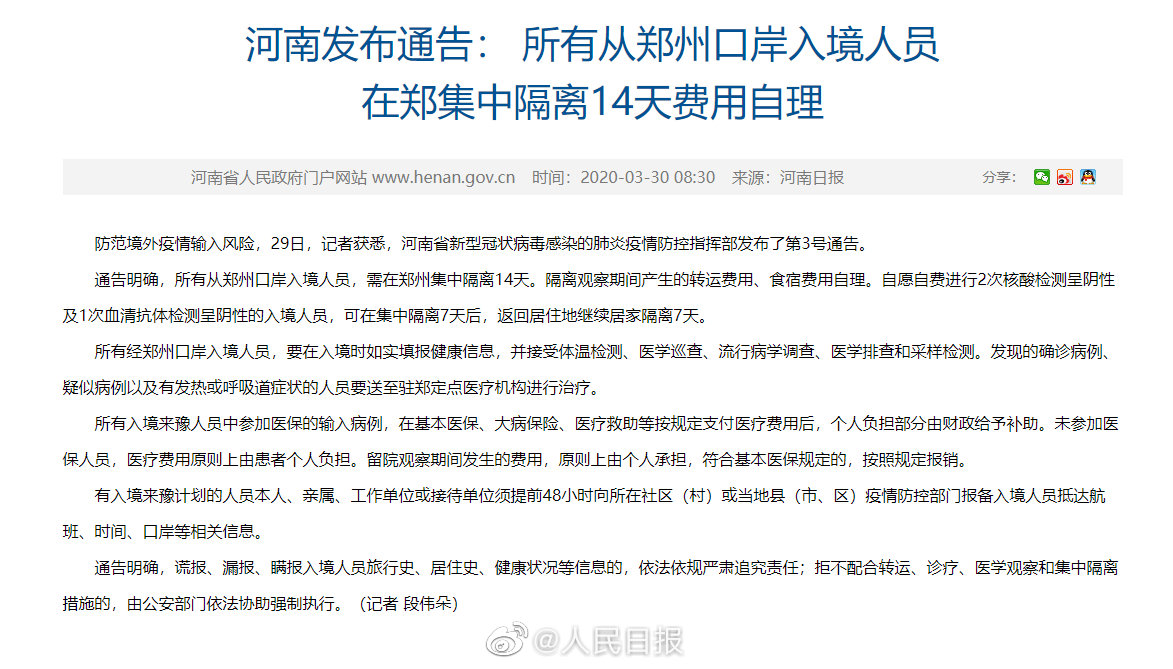 29日,河南省新型冠状病毒感染的肺炎疫情防控指挥部发布第3号通告。通告明确,所有从郑州口岸入境人员,需在郑州集中隔离14天。隔离观察期间产生的转运费用、食宿费用自理。自愿自费进行2次核酸检测呈阴性及1次血清抗体检测呈阴性的入境人员,可在集中隔离7天后,返回居住地继续居家隔离7天。
