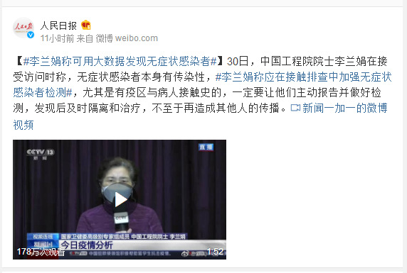 30日,中国工程院院士李兰娟在接受访问时称,无症状感染者本身有传染性,#李兰娟称应在接触排查中加强无症状感染者检测#,尤其是有疫区与病人接触史的,一定要让他们主动报告并做好检测,发现后及时隔离和治疗,不至于再造成其他人的传播。
