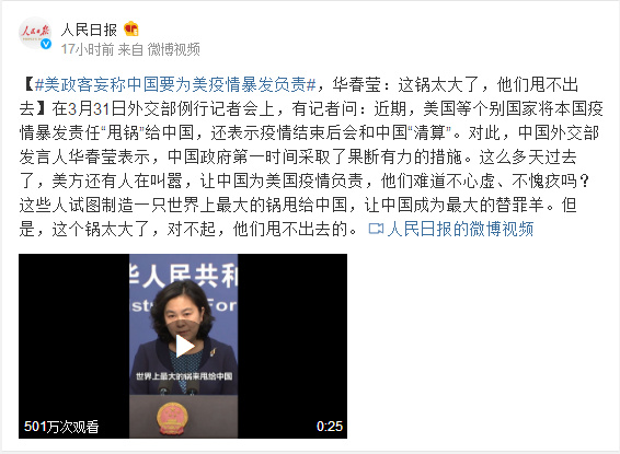 在3月31日外交部例行记者会上,有记者问:近期,美国等个别国家将本国疫情暴发责任“甩锅”给中国,还表示疫情结束后会和中国“清算”。对此,中国外交部发言人华春莹表示,中国政府第一时间采取了果断有力的措施。这么多天过去了,美方还有人在叫嚣,让中国为美国疫情负责,他们难道不心虚、不愧疚吗?这些人试图制造一只世界上最大的锅甩给中国,让中国成为最大的替罪羊。但是,这个锅太大了,对不起,他们甩不出去的。