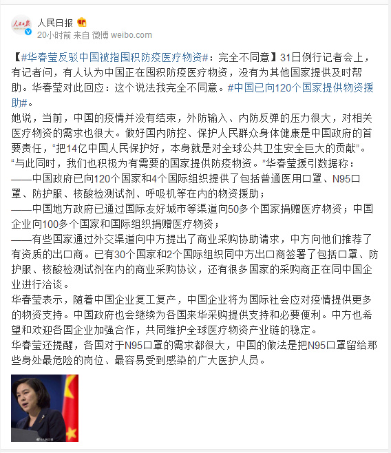 31日例行记者会上,有记者问,有人认为中国正在囤积防疫医疗物资,没有为其他国家提供及时帮助。华春莹对此回应:这个说法我完全不同意。#中国已向120个国家提供物资援助#。