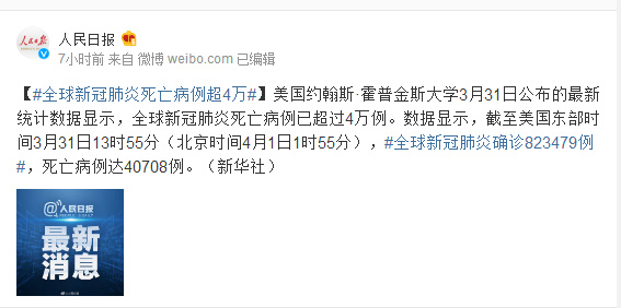 美国约翰斯·霍普金斯大学3月31日公布的最新统计数据显示,全球新冠肺炎死亡病例已超过4万例。数据显示,截至美国东部时间3月31日13时55分(北京时间4月1日1时55分),#全球新冠肺炎确诊823479例#,死亡病例达40708例。(新华社)