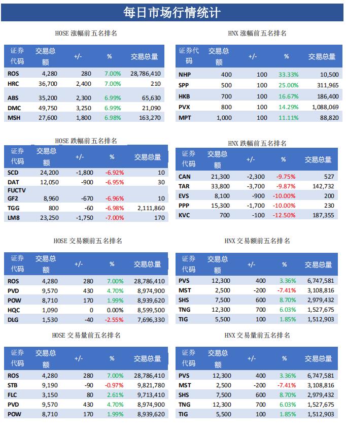 市场近期的大幅反弹,加上昨晚美国股市也强劲反弹,有助于市场继续保持短期向好趋势。资金流在开盘后快速涌入市场,帮助越南指数迅速拉升超过10点以上,并持续至收盘。其中,蓝筹股继续在市场上发挥领导作用,GAS涨停至6.7万越盾/股、VCB上涨5.2%至7.1万越盾/股、VRE上涨5.3%、PLX上涨4.2%、PNJ上涨3.2%、VJC上涨3%、VIC上涨2%。最不幸的是SAB,开盘冲涨停,尾盘却回落,收盘时涨幅仅为1.4%。