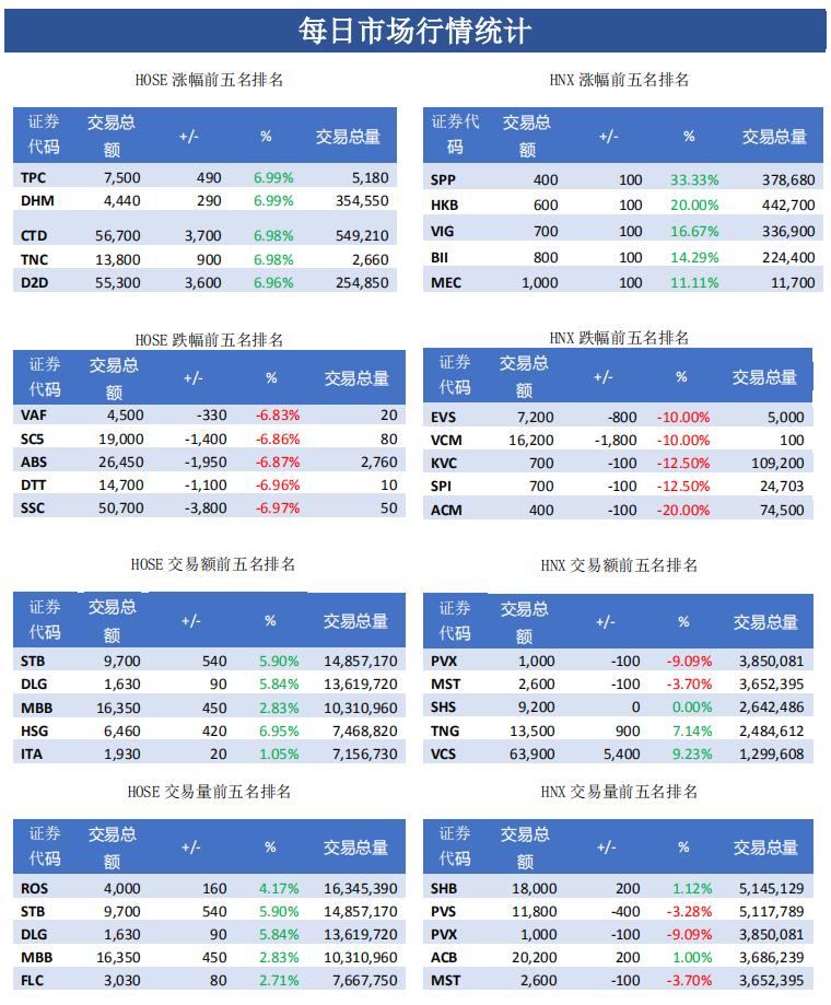 市场向多头倾斜,胡志明交易所和河内交易所共有370支股票上涨。 市场的上涨也影响到各个板块,例如证券,房地产,建筑,纺织,工业区等板块的股票都大幅上涨, 甚至有部分股票封住涨停。 此外,航空股如 HVN,ACV,SCS,AST和SGN继续保持上涨走势。 另一方面,石油板块如GAS,PVB,PVD,PVS,PVT,PXS 受全球油价 影响而下跌。 在衍生证券市场上,所有期货合约均上涨,其中F2004期货合约在周四(4月16日)到期日之前仅保持-5.3点的负基差。