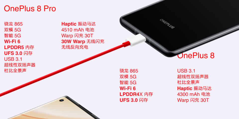 一加 8 系列采用时下顶级的硬件配置,搭载⾼通骁龙 865 平台,新⼀代的 Wi-Fi 6 网络。一加 8 系列新品搭载超高规格的双扬声器,支持杜比全景声,采用体积更大的横向Haptic 振动马达带来更爽的振动反馈,配合出类拔萃的瞳孔屏显示效果,为用户带来视听触全方面的升级。