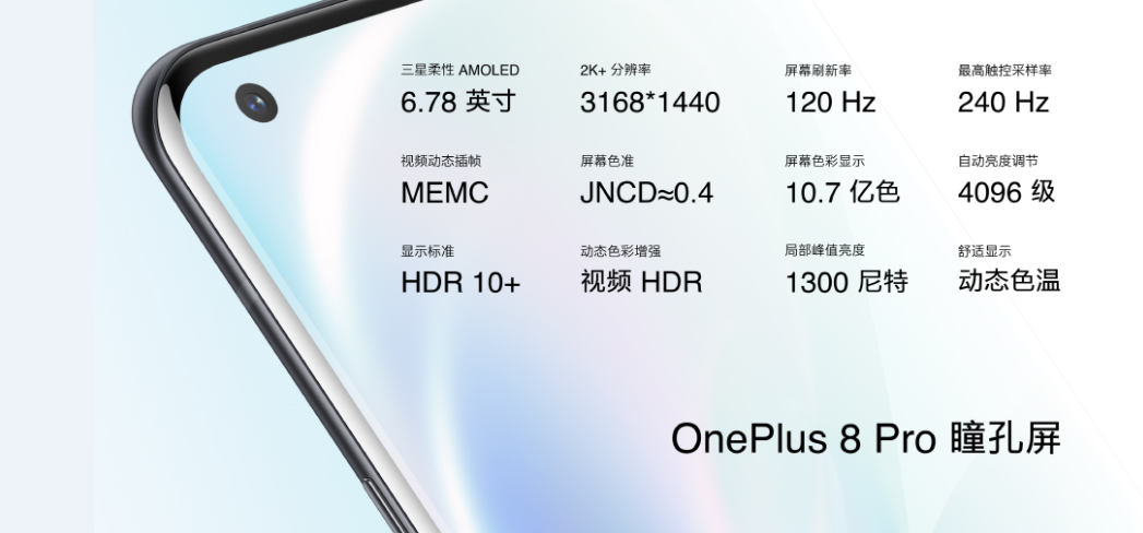 一加 8 Pro的瞳孔屏拥有高达 120Hz 的屏幕刷新率,触控采样率最高可达240Hz;分辨率为 3168*1440,达到 2K+ 级别;PPI高达513;最高亮度可达到1300nit。同时,一加通过出色的软件调校,在一加 8 Pro 上实现了 4096 级自动亮度调节,利用前置狭缝和后置光线感应器,让屏幕亮度变幻更加柔和舒适。一加 8 Pro 的环境光色温传感器让屏幕能够随着外界色温变化来调节屏幕冷暖色温,舒适性更佳。