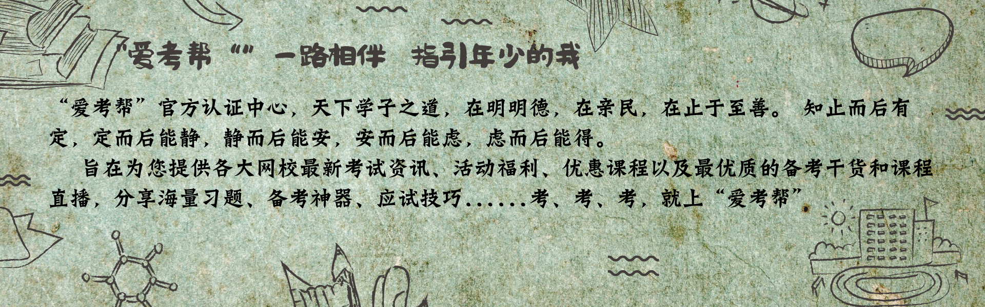 “爱考帮”官方认证中心,天下学子之道,在明明德,在亲民,在止于至善。 知止而后有定,定而后能静,静而后能安,安而后能虑,虑而后能得。