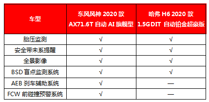 2020款AX7 AI旗舰型不仅拥有BSD盲点监测系统、胎压监测、全景影像等实用功能,还比哈弗H6铂金超豪版多出FCW前碰撞预警系统、AEB刹车辅助系统等安全配置,优势更为明显。