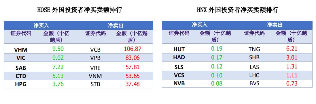 外资继续净卖出,三市净卖出总额约4700亿越南盾。卖盘集中于VCB(-1068.7亿越南盾),VPB(-830.6亿越南盾),VRE(-578.1亿越南盾),VNM(-536.5亿越南盾)。