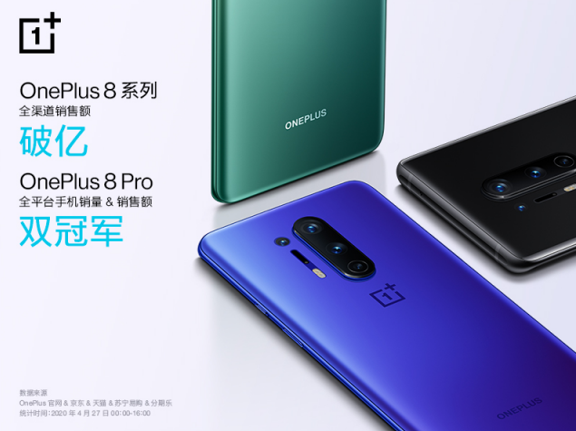 4月27日,一加 8 系列再次开售,全渠道销售额破亿。一加 8 Pro 斩获全平台手机单品销量、销售额双冠军。一加 8 系列上市后好评如潮,全平台持续热销,首销当天一加 8 系列就获得了开售一分钟全网销售额破亿的亮眼成绩。由于火爆程度远超预期,一加 8 系列全系机型在各电商销售平台一度断货。