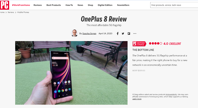 知名科技媒体《Tom‘s Guide》对一加 8 的评价与《The Verge》相似,他们高度认可一加 8 的性能表现,指出:一加 8 以诱人的价格,为你带来了稳健的性能,长续航和 5G 网络。